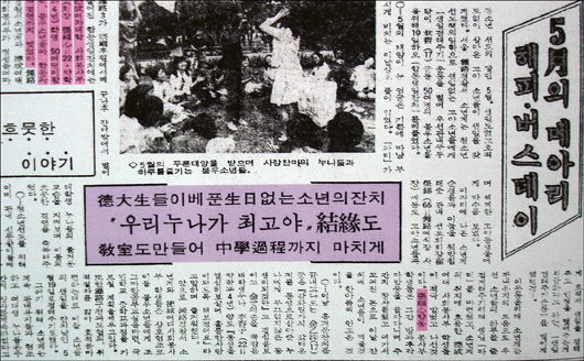 ‘5월의 메아리 해피·버스데이’라는 제하의 기사에는 ‘덕대생들이 베푼 생일없는 소년의 잔치’, ‘우리누나가 최고야, 결연도’라는 소제목이 달리기도 했다.