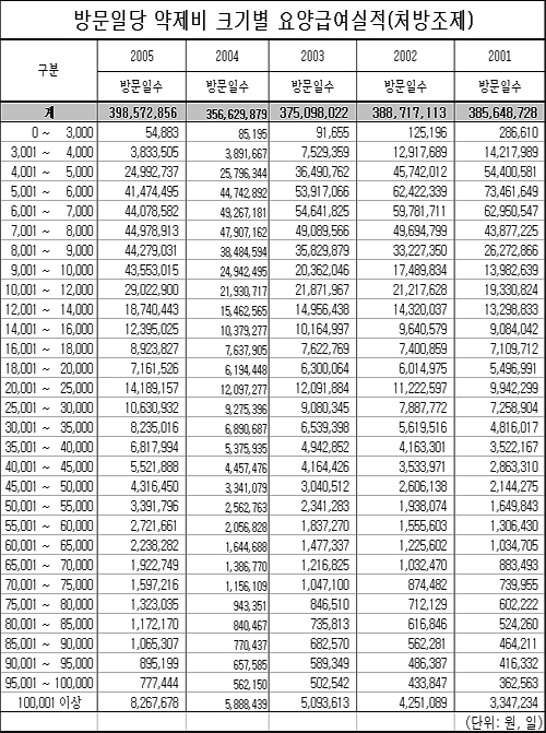 11일 심평원의 ‘방문당 약제비 크기별 이용현황’에 따르면 지난 2005년 처방조제 환자는 총 3억9,857만명으로, 지난 2001년 3억8,564만명 보다 1,292만명(3.35%)이 증가했다.
