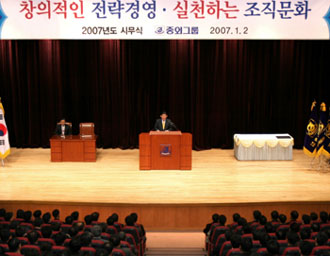 중외제약(대표 이경하)은 2일 이종호 회장, 이경하 사장을 비롯해 팀장 이상 간부급 임직원 300여명이 함께 한 가운데 신년 시무식을 갖고 '창의적인 전략경영', '실천하는 조직문화'를 2007년도 경영방침으로 확정 발표했다.