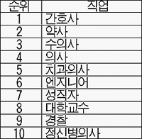 조사 결과를 보면 1위는 간호사, 2위는 약사가 차지했으며, 의사는 4위, 성직자는 7위를 차지했다.