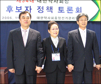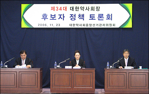 이날 정책토론회에서 전영구, 권태정, 원희목 세 후보는 의약분업 책임론과 성분명처방 달성을 위한 해법을 놓고 불꽃 튀는 공방전을 벌였다.