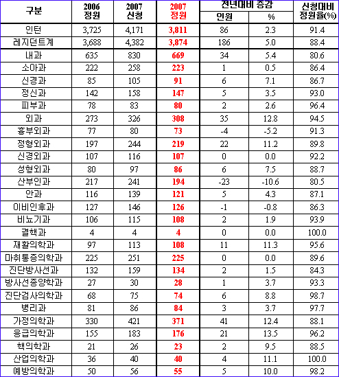 2007년도 전공의 정원이 인턴 3,811명, 레지던트 3,874명으로 최종 확정됐다.