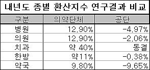 공단이 수행한 내년도 환산지수 연구결과에서는 병원·의원·한방·약국이 모두 ‘마이너스값’이 도출된 반면, 각 단체가 수행한 연구에서는 평균 두 자리 수 이상 인상돼야 한다는 결과가 나왔기 때문.