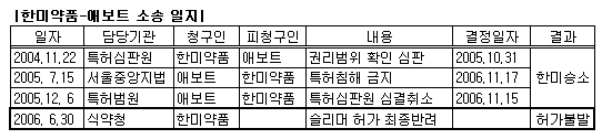 이와 별도로 특허법원도 지난 15일 애보트가 특허심판원의 2005년 10월 31일자 심결(슬리머는 리덕틸의 권리범위에 해당되지 않음)에 불복해 제기한 취소소송을 기각했다.