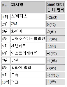 메드에드뉴스 10월호 발표에 따르면 지난해까지 5년동안 부동의 1위를 지켰던 화이자는 노바티스에게 자리를 내주고 3위로 내려앉았으며 2위는 지난해와 마찬가지로 J&J에게 돌아갔다.