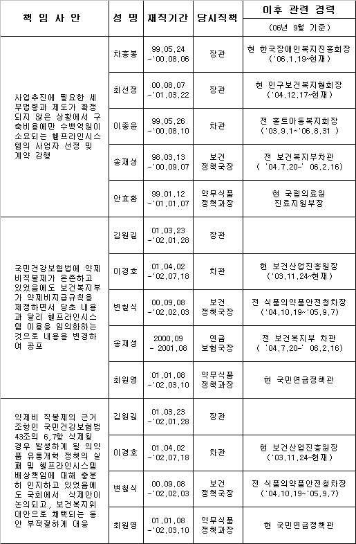 참여연대는 책임대상 전현직 관료들로 차흥봉, 최선정 당시 복지부장관과 이종윤 차관, 송재성 보건정책국장, 안효환 약무식품정책과장 등을 꼽았다.