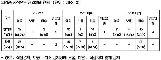 또, 15℃ 이하의 경우 병·의원은 48%인 12곳이 양호, 나머지 50%인 13곳이 관리가 미흡했고, 약국의 경우 55.6%인 15곳이 제대로 관리하고 있었지만, 18.5%인 5곳은 관리가 미흡한 것으로 조사됐다.