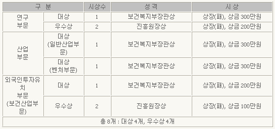 보건산업기술대전 개막식인 12월 14일 시상하는 이번 포상은 연구대상, 산업대상, 투자유치대상 등 3개 부문에서 개인과 단체를 포함, 총 8인에게 시상한다.