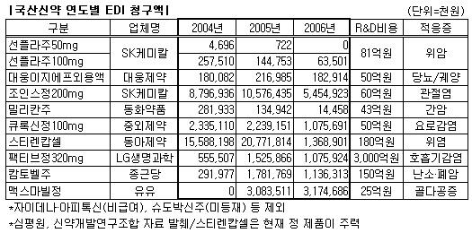 이밖에 국산신약 1호인 SK케미칼의 선플라주(위암)는 2억원에 못 미치는 청구액을 기록했고 바이오의약품인 대웅제약의 이지에프외용액(당뇨/궤양)도 2억원대에 머물렀다.