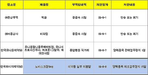 특히 노바스크정 5mg의 경우 도매업체에서 병포장의 안전캡을 연 이후 나타나는 알루미늄 포일 형태의 밀봉포장 봉함이 열린 제품이 발견된 부분에 대해 '의약품 일부 미봉함' 부적합 내역으로 당해품목 제조업무정지 15일 처분을 내렸다.