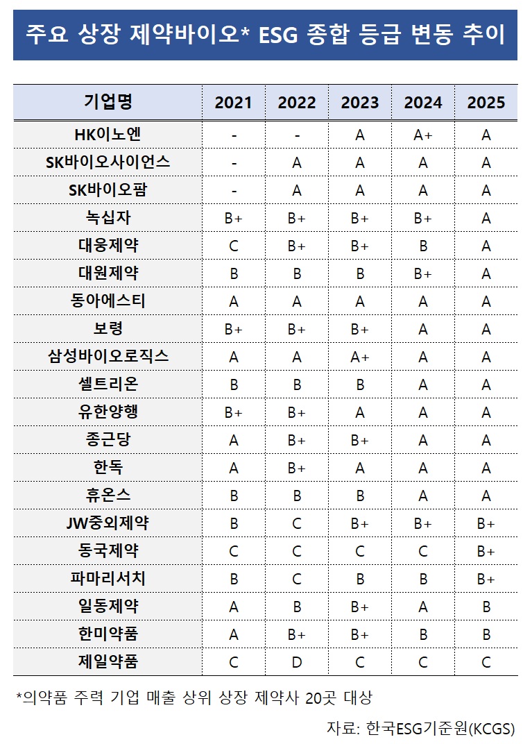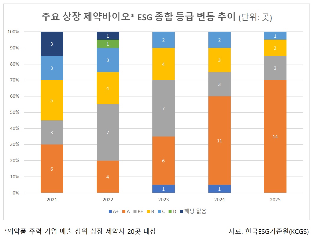 국내 주요 제약바이오 기업의 ESG(환경·사회·지배구조) 경영 수준이 지난 4년간 비약적으로 성장했다. 상위 20개사 ESG 등급 변화를 분석한 결과 2021년 전체의 30%에 불과했던 A등급 기업 비중이 2025년 70%로 2배 이상 급증한 것으로 나타났다.