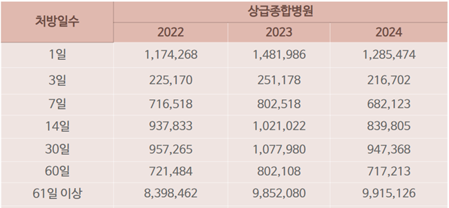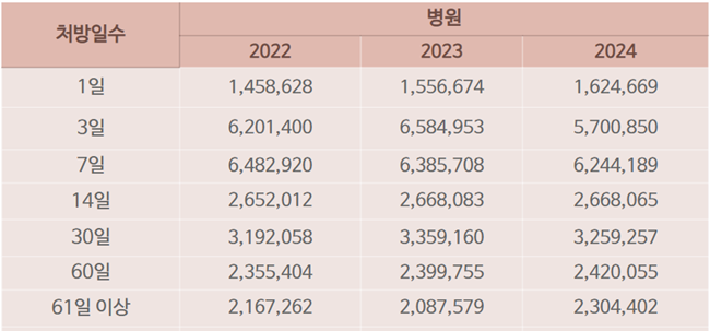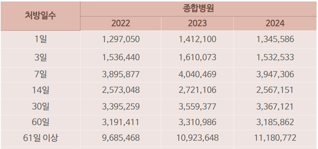 종합병원의 장기처방도 상승세를 보였다. 2022년 대비 2024년 61일 이상 처방이 15.4% 증가했다. 다른 처방일수 구간에서는 큰 폭의 증가나 감소가 이뤄지지 않았다.