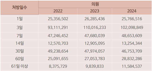 무엇보다 의원급의 장기처방이 가장 크게 증가했다. 지난 2022년 837만5729회였던 61일 이상 처방이, 2023년에는 983만9833건으로 늘어나더니 작년에는 1158만4537건으로 3년간 총 38.3% 상승했다.