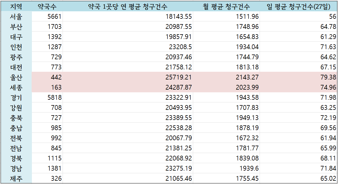 울산은 442개 약국이 있고, 월 평균 청구건수는 2143건이었다. 한 달에 27일을 운영한다는 가정으로 일 평균 청구건수는 79건이다.