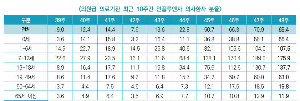 7.9명(42주)→13.6명(43주)→22.8명(44주)→50.7명(45주)→66.3명(46주)→70.9명(47주)로 지속적인 증가하다 69.4명(48주)으로 소폭 줄어들었다. 다만 병원급 의료기관과 상급종합병원급 의료기관 입원환자 수는 증가 또는 유지를 보였다.