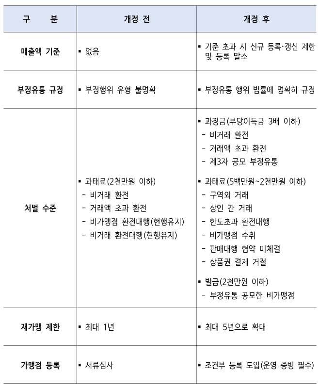 또한 가맹점 등록 취소 시 지원 중단 기간과 재가맹 제한 기간이 기존 최대 3년·1년에서 각각 최대 5년으로 늘어난다.