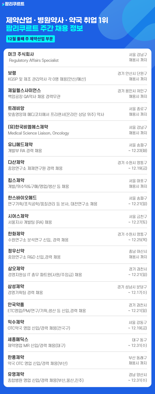 [팜리쿠르트] 머크·보령·제일헬스 등 약사 채용