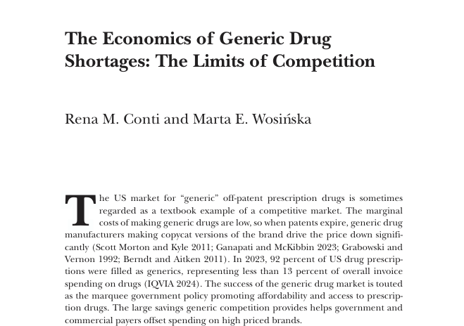 이들은 미국 제네릭 시장이 ‘경쟁을 통한 가격 효율성 극대화’라는 성공을 거뒀지만, 그 결과 ‘만성적인 필수의약품 공급 부족’이라는 구조적 실패를 낳았다고 지적한다. 이들의 연구는 전미경제학회(AEA, American Economic Association)가 발간하는 공식 학술지 ‘Journal of Economic Perspectives(경제전망저널)’ 2025년 봄호에 게재된 바 있다.