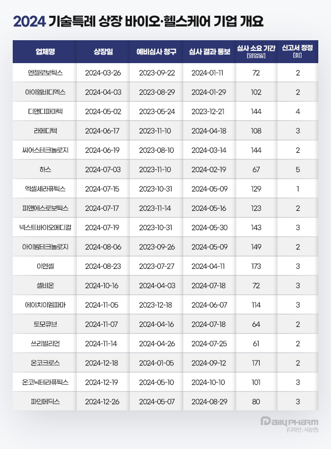 올해에는 초단기 심사 기업도 크게 증가했다. 지난해에는 60영업일 내 심사를 마친 기업이 0곳으로 전무했는데 올해의 경우 60영업일 미만으로 예비심사를 통과한 기업이 다섯 곳에 달했다. 알지노믹스 불과 40영업일 만에 심사를 통과하며 신기록을 세웠고 에임드바이오(41영업일), 큐리오시스(46영업일), 뉴로핏(51영업일), 쿼드메디슨(53영업일) 등은 두 달이 채 안 돼 승인을 받았다.