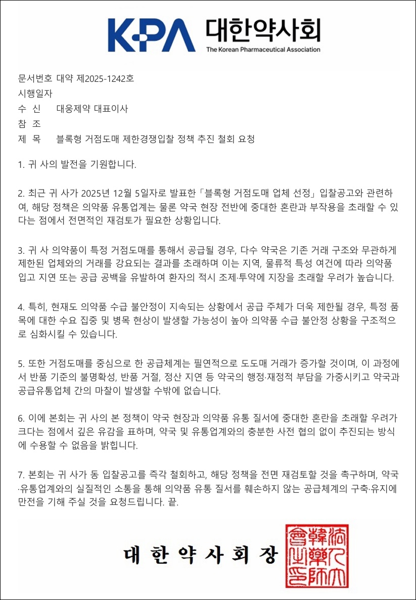 약사회는 공문에서 “귀사가 5일자로 발표한 블록형 거점도매 업체 선정 입찰공고와 관련, 해당 정책은 의약품 유통업계는 물론 약국 현장 전반에 중대한 혼란과 부작용을 초래할 수 있다”며 “전면적인 재검토가 필요한 상황”이라고 밝혔다.