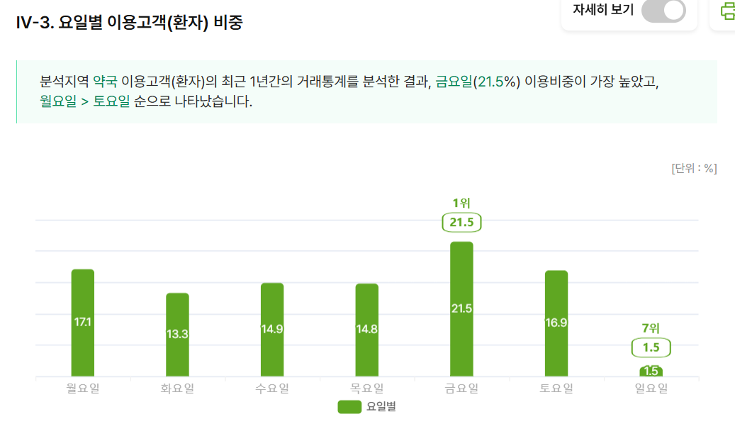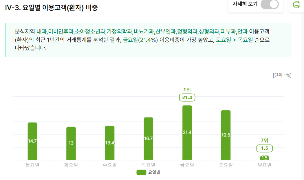요일별로는 의원과 마찬가지로 금요일이 21.5%로 가장 많았고 월요일 17.1%, 토요일 16.9%, 수요일 14.9%, 목요일 14.8%, 화요일 13.3%, 일요일 1.5%로 나타났다.