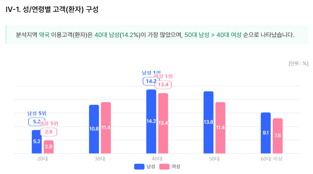 약국 이용환자는 40대 남성이 14.2%로 가장 많았으며 50대 남성 13.8%, 40대 여성 13.4%, 30대 남성·50대 여성 11.4%, 30대 남성 10.8%로 의원과 마찬가지로 30·40·50세대 비율이 높았다.