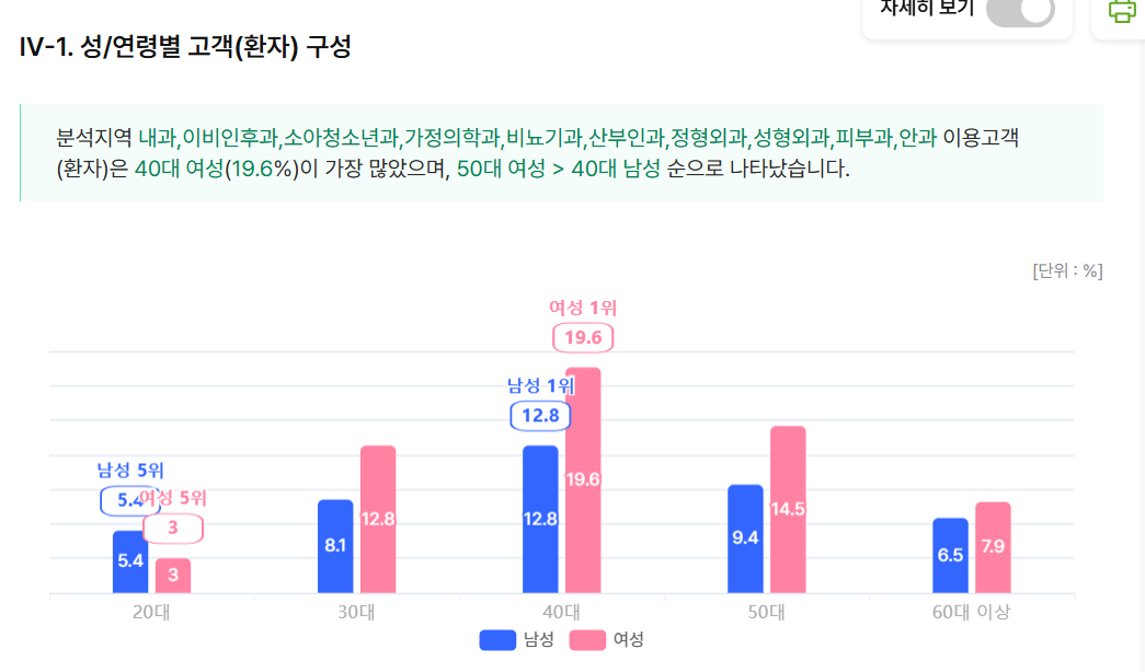 의원 고객(환자)를 성별·연령별로 구분한 결과 30대부터 50대까지에 집중돼 있었다.