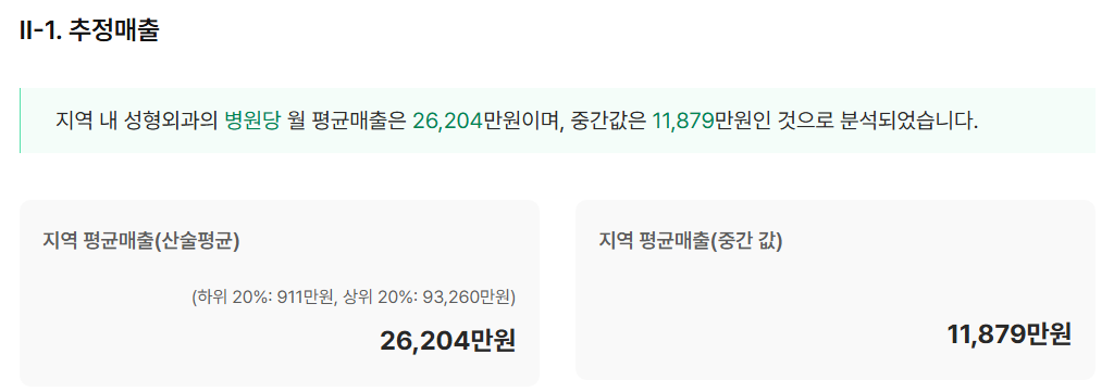 매출액은 성형외과가 2억6204만원으로 압도적으로 높았으며 피부과도 1억2683만원을 기록했다. 정형외과와 소아청소년과도 7691만원, 5094만원으로 집계됐으며 안과 4982만원, 이비인후과 3033만원, 산부인과 3101만원, 비뇨기과 2378만원 순으로 나타났다.
