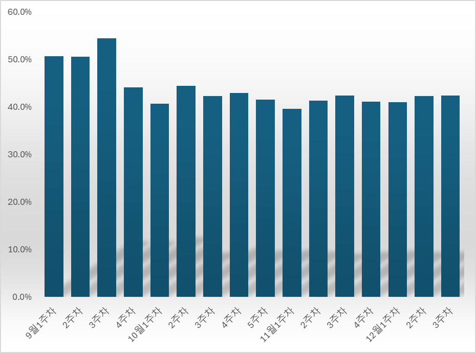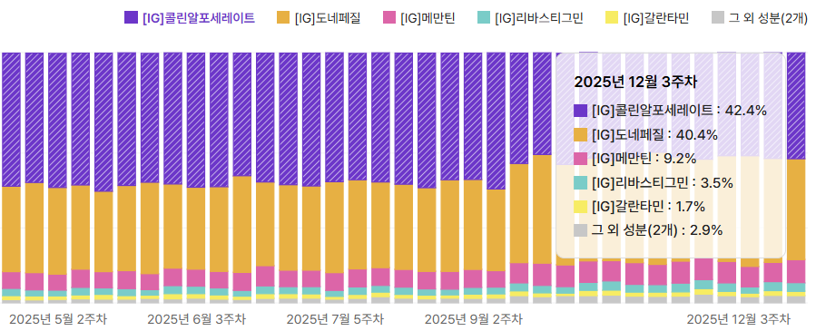 지난 10월 2주차 콜린제제의 점유율은 44.5%로 전주보다 3.8%포인트 상승했고 이후 큰 변동이 감지되지 않았다. 11월 1주차 39.7%를 기록한 이후 2주 연속 상승하면서 11월 2주차에 42.5%를 나타냈고 12월 1주차 41.1%를 나타낸 이후 소폭 상승 흐름을 나타냈다.