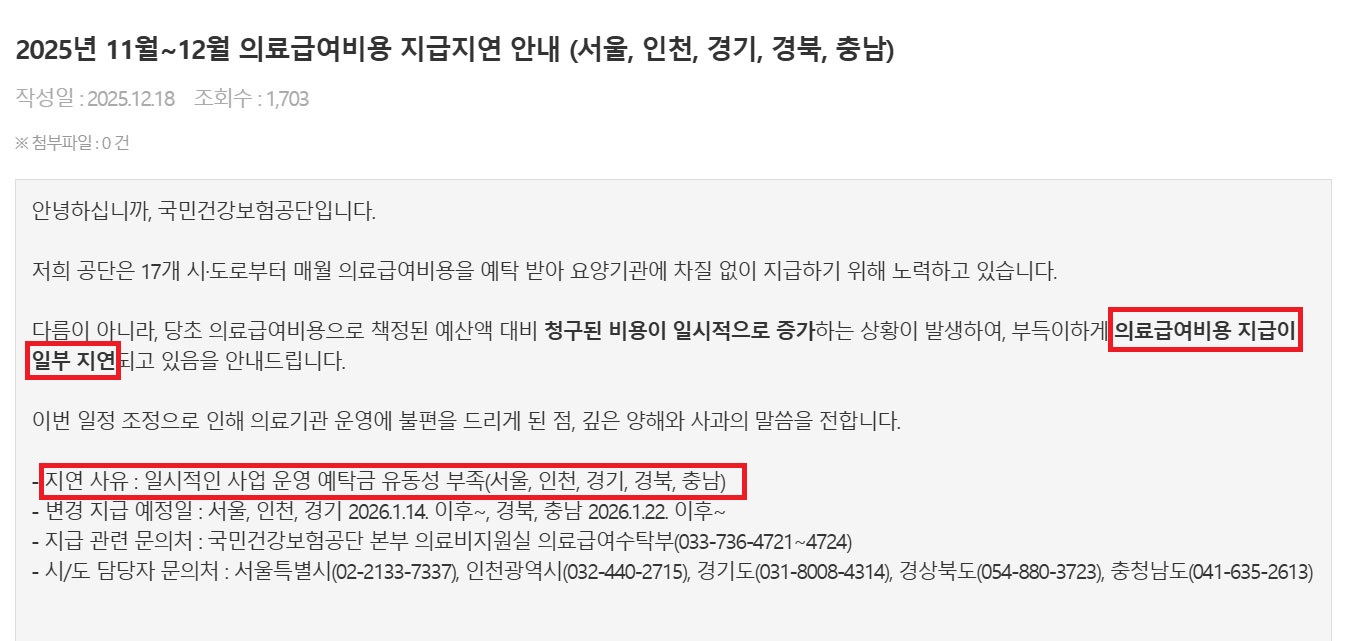 건강보험공단은 "17개 시도로부터 매월 의료급여비용을 예탁받아 요양기관에 차질없이 지급하기 위해 노력하고 있으나 당초 의료급여비용으로 책정된 예산액 대비 청구된 비용이 일시적으로 증가하는 상황이 발생, 부득이하게 의료급여비용 지급이 일부 지연되고 있다"고 밝혔다.
