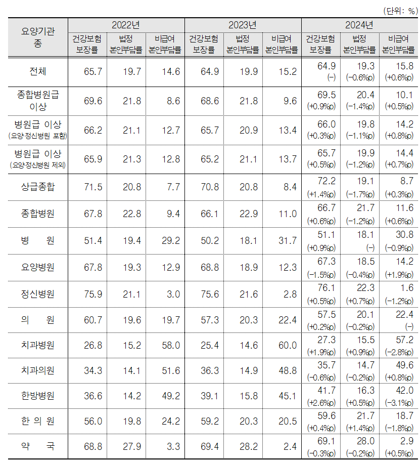 요양기관별로 놓고 보면 약국과 요양병원의 보장률이 하락했다. 약국의 건강보험 보장률은 69.4%에서 69.1%로 감소했고, 비급여 본인부담률은 2.4%에서 2.9%로 상승했다.