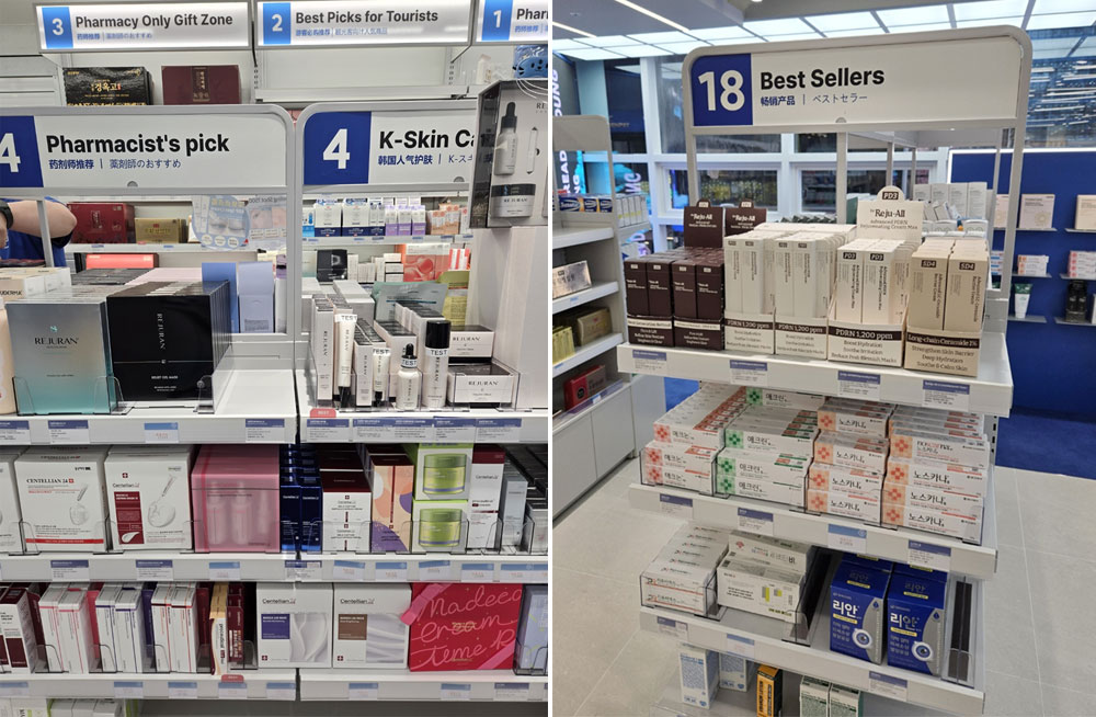 대표적인 OTC 품목이 리쥬비넥스, 노스카나, 애크논, 애크린, D-판테놀, 도미나크림입니다. 리쥬란, 리쥬올, VT리들샷 같은 화장품류 역시 Best Picks for Tourists 매대에 빠지지 않는 단골입니다.
