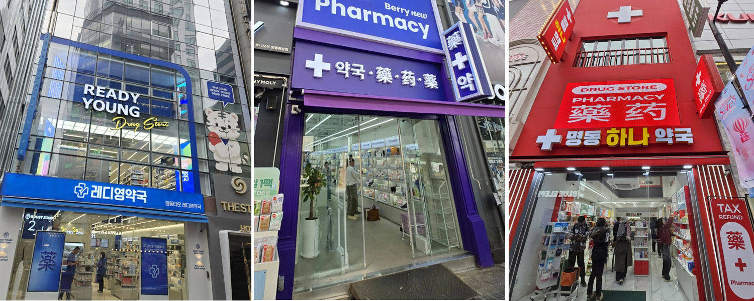 외국인 관광객을 위한 전광판은 물론 상품설명태그, 택스리펀드, 환전 공간, 포토스팟 등 까지 구비된 약국이 줄지어 모습을 드러내고 있습니다.