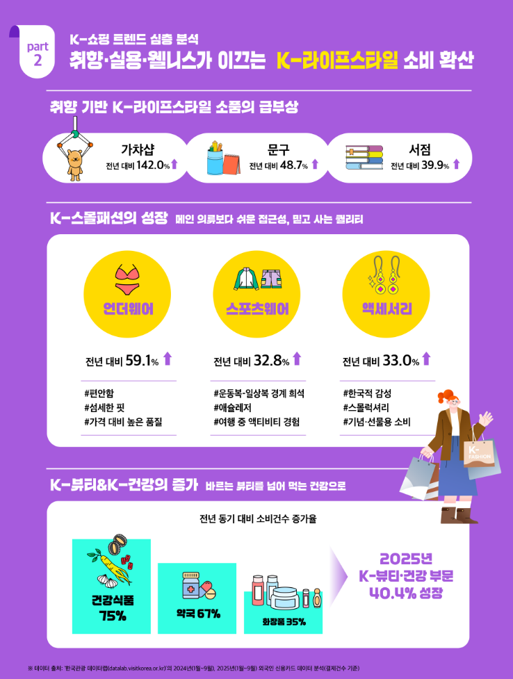 관광공사는 "K-뷰티가 한국 방문의 핵심 소비로 자리 잡으면서 뷰티 소비 확산은 약국 소비 증가로 이어지고 있다"며 "외래객들이 더 이상 아플 때 쓰는 약을 사는 것이 아니라 피부, 영양관리 등 일상형 웰니스 제품을 찾으며 피부, 영양관리 관련 제품들에서 매출 증가가 나타나고 있다"고 분석했습니다.