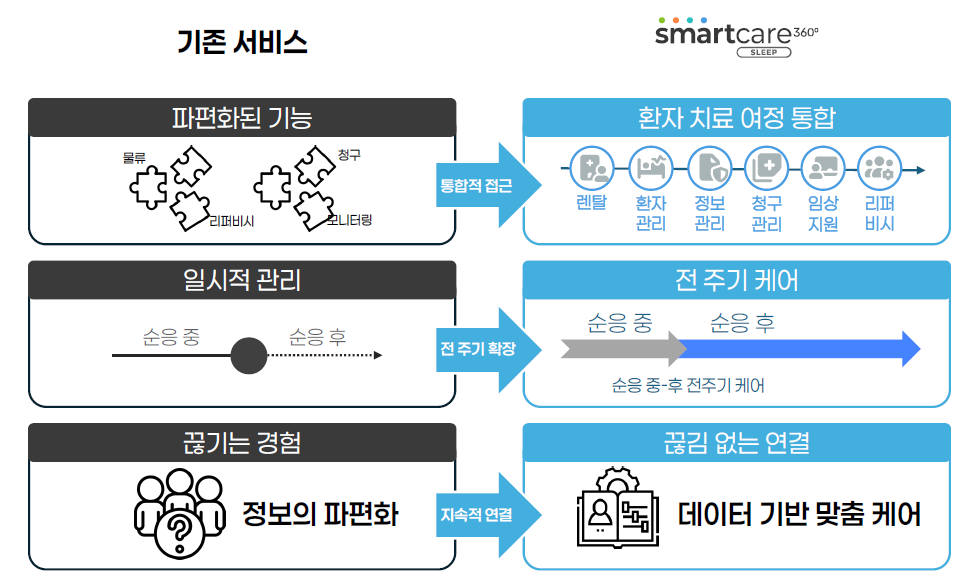 이런 상황에서 멕헬스케어는 ‘스마트케어 360 슬립’를 통해 파편화된 기능을 통합해 환자의 치료 여정 전반을 설계하는 데 초점을 맞췄다.