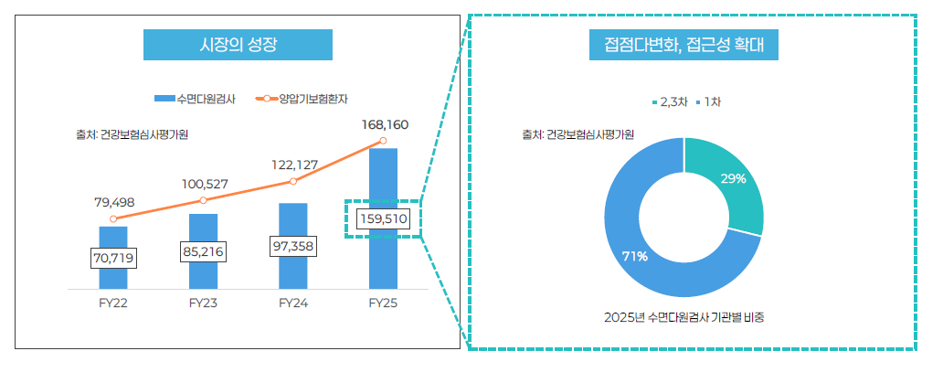 건강보험심사평가원에 따르면 수면다원검사 시행건수는 2024년 9만7358건에서 2025년 15만9510건으로 폭발적인 성장세를 기록했다. 같은 기간 양압기 보험 환자 수 역시 12만2127명에서 16만8160명으로 크게 늘었다.