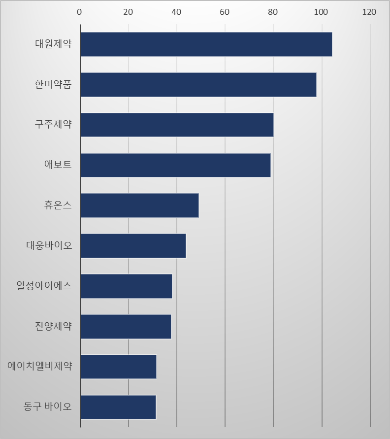 업체별 클래리트로마이신제제의 처방액을 보면 대원제약의 클래신이 지난해 가장 많은 104억원을 기록했다. 한미약품의 클래리가 98억원의 처방액을 올렸고 구주제약의 클래리미신과 애보트의 클래리시드가 각각 80억원, 79억원으로 뒤를 이었다. 휴온스, 대웅바이오, 일성아이에스, 진양제약, HLB제약, 동구바이오제약 등이 지난해 클래리트로마이신 처방 시장에서 30억원 이상을 올렸다.