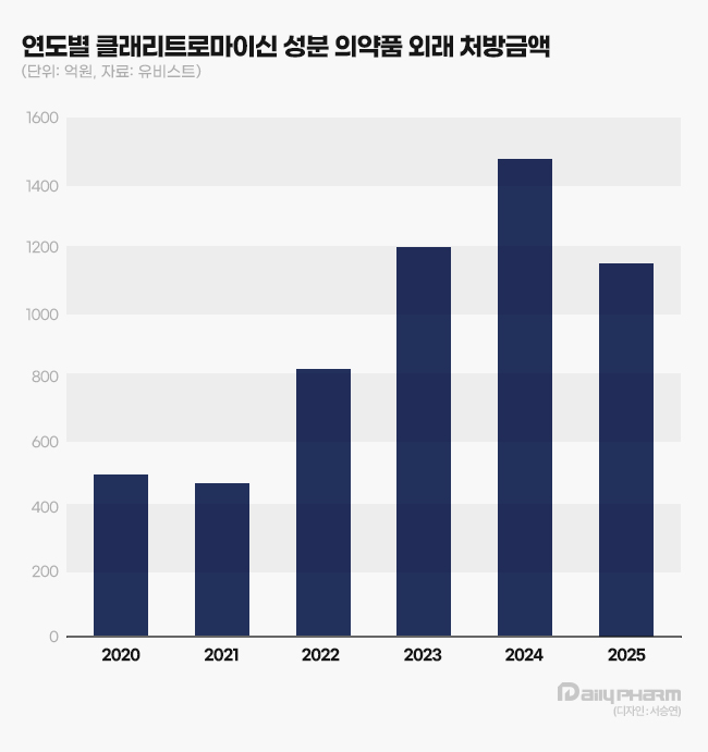의약품 조사기관 유비스트에 따르면 지난해 클래리트로마이신의 외래 처방시장 규모는 1150억원으로 집계됐다.