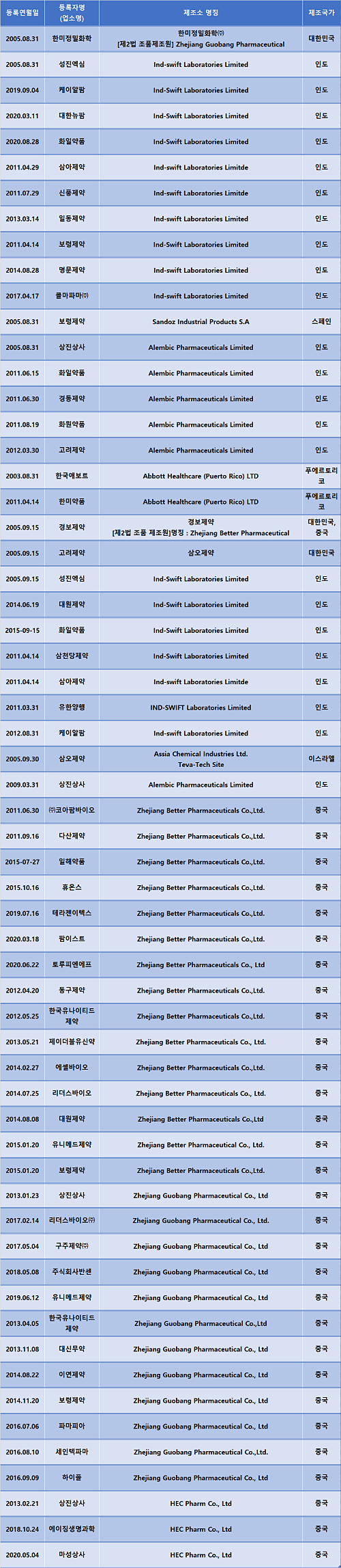 식약처에 등록된 클래리트로마이신 원료의약품 60건 중 중국과 인도가 54건으로 90%를 차지했다. 중국 제조소에서 생산한 클래리트로마이신 원료의약품 31건이 국내에 등록됐고 인도산 원료의약품은 23건 등록됐다. 푸에르토리코 업체가 2건 등록됐고 스페인과 이스라엘 업체가 생산한 클래리트로마이신 원료의약품이 각각 1건 등록됐다.
