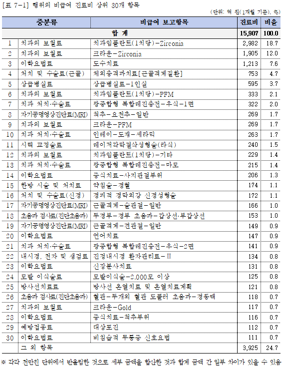 치과에서는 치과임플란트(1치당)가 3610억 원(43.0%), 크라운 2469억 원(29.4%), 치과교정 847억원(10.1%) 순으로 상위 3항목이 치과 비급여 82.6%를 차지했다.