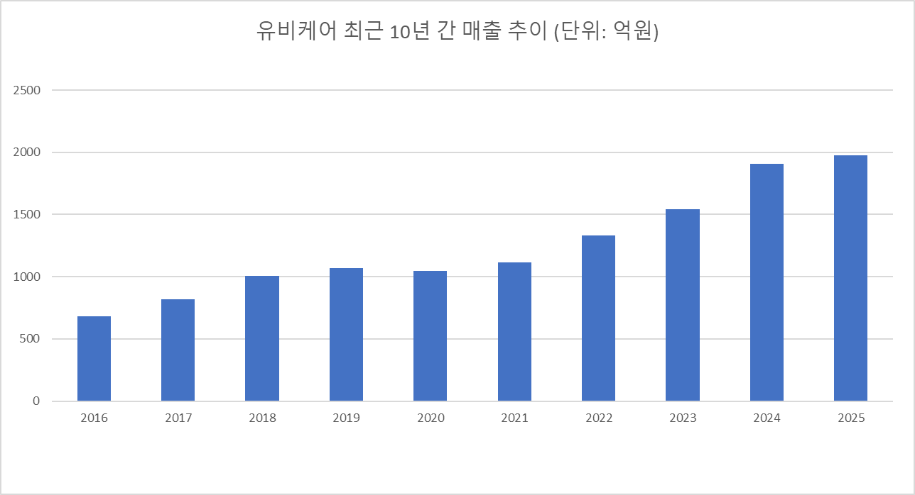 유비케어 지난해 매출은 녹십자그룹 편입 이전인 2019년과 비교해 2배 가량 증가했다. 2019년 1070억원 수준이던 유비케어 매출은 녹십자그룹 편입 이후 꾸준한 증가세를 보였다. 이 회사 매출은 2020년 1048억원으로 잠시 숨을 고른 뒤 2021년 1118억원으로 전년보다 6.7% 늘었다. 이후 2022년 1333억원, 2023년 1540억원, 2024년 1906억원으로 매년 두 자릿수 성장률을 기록하며 외형 성장을 본격화했다. 이어 지난해에도 성장 기조를 이어가며 역대 최대 실적을 달성했다.