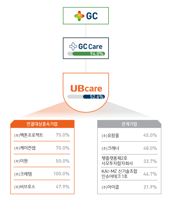 유비케어는 병·의원과 약국을 대상으로 한 EMR 솔루션을 주력으로 하는 디지털 헬스케어 플랫폼 기업이다. 지난 2020년 GC녹십자헬스케어(현 GC케어)가 최대주주로 올라서며 녹십자그룹에 편입됐다. 당시 GC케어는 유비케어 최대주주·2대주주였던 유니머스홀딩스·카카오인베스트먼트와 총 2088억원 규모로 인수 계약을 체결했다. 지난해 9월 말 기준 GC케어는 유비케어 지분 52.7%를 보유하고 있으며 녹십자그룹 지주회사 녹십자홀딩스는 GC케어 지분 94.0%를 중이다.