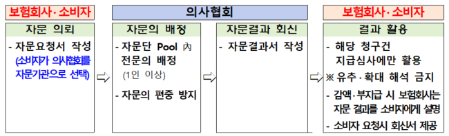 의료자문은 소비자가 의협을 자문기관으로 선택→보험회사는 의협에 자문 의뢰→의협은 관련 학회와 긴밀하게 협의해 독립적으로 자문의 배정→자문결과 보험회사에 회신하는 방식으로 진행된다.