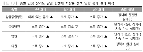 정책 영향 분석 평가 측면에서 종별 전체 상병, 종별 급성 상기도 감염 항생제 처방률에 대해 의약분업이라는 정책 개입은 감소 추세에 있는 항생제 처방률 시계열 데이터에 미치는 정책 영향이 없는 것으로 분석됐다.