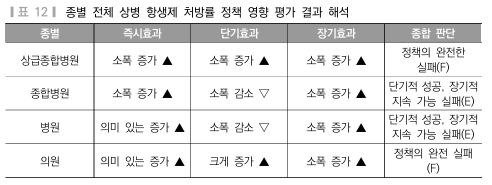 의료정책연구원은 "정책목표달성과 정책 영향 분석 평가 결과를 종합하면 의약분업은 정책 목표 달성도 하지 못하고, 정책 영향도 주지 못했기 때문에 평가 정책목표(의약품 오남용 억제, 항생제 처방 감소)를 달성하지 못한 실패한 정책"이라고 평가했다.