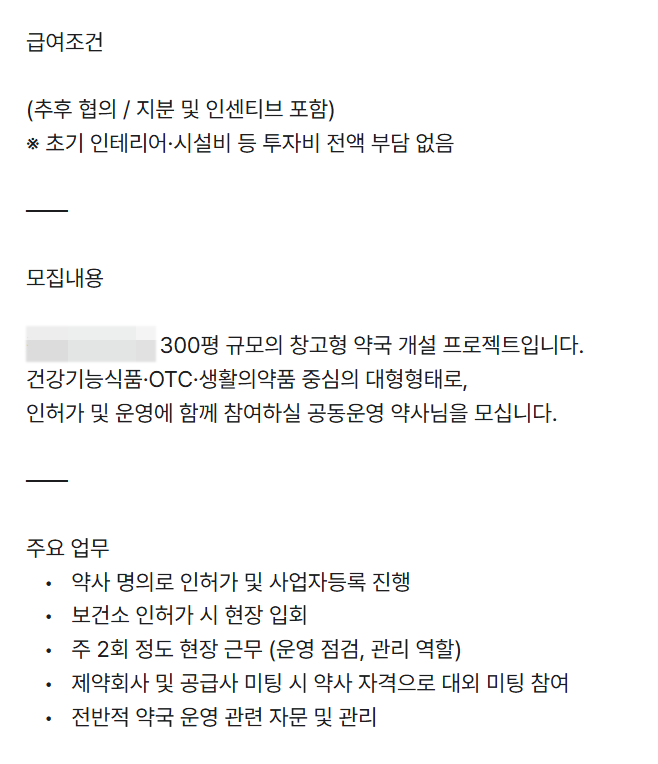 부동산 임대 중개업을 하는 업체가 300평 규모 창고형 약국 개설 프로젝트 인허가 및 운영에 참여할 약사를 모집한다는 내용으로 구인공고를 낸 것이다.