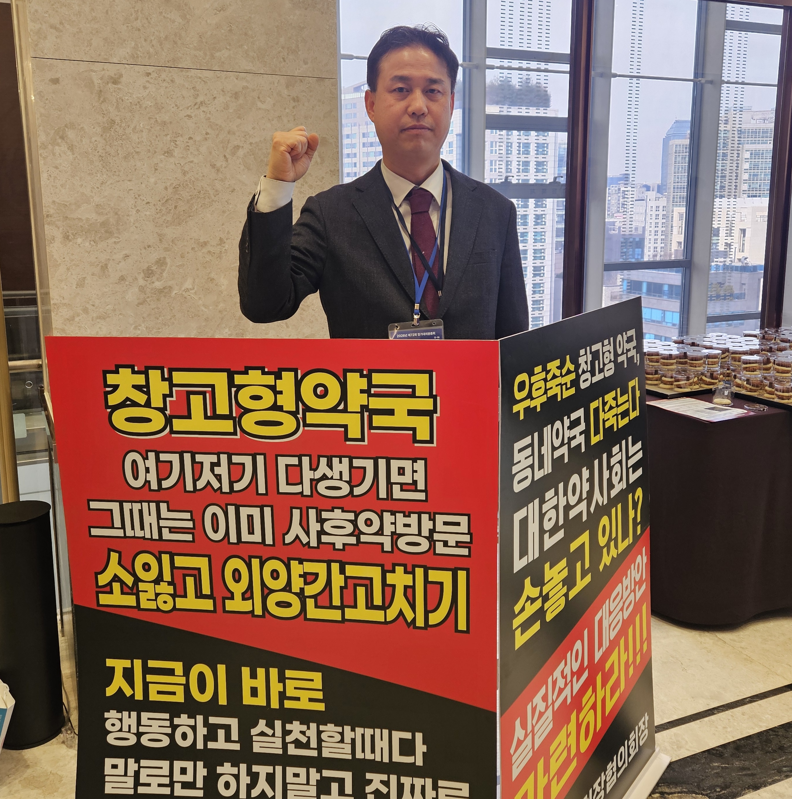 총회장에서는 창고형약국 문제 대응을 촉구하는 1인 시위도 진행되며 현장 긴장감이 고조됐다.