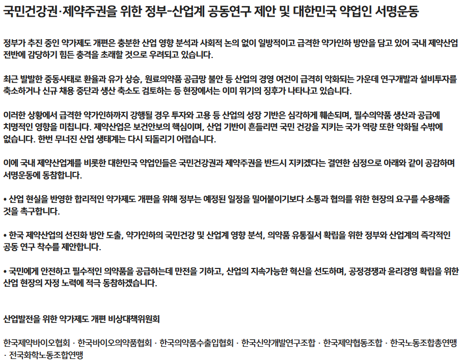제약업계 "약가개편 공동연구 제안...제약주권 서명운동 착수”