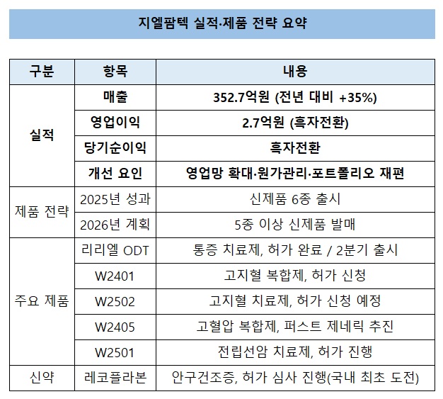 지엘팜텍은 개량신약 기반의 안정적 현금창출 구조와 신약 파이프라인을 동시에 확보하는 전략을 유지한다는 방침이다. 실적 턴어라운드를 기반으로 제품 상업화 속도가 이어질 경우 중장기 성장 궤도 진입이 가능하다는 분석이다.