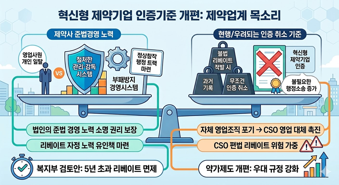 해당 규정이 개편안에 반영되지 않을 경우 제약사의 리베이트 금지 준법경영 노력이 혁신형 인증 취소 심사 때 전혀 반영되지 않는 문제가 발생하고, 인증 취소 부당성을 법정에서 다툴 필요성이 커지면서 제약사와 복지부 간 불필요한 행정취소 소송 건수가 크게 늘어날 수 있다는 이유에서다.